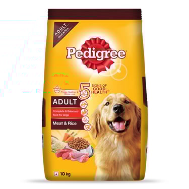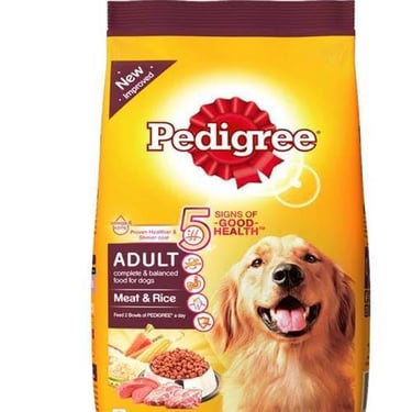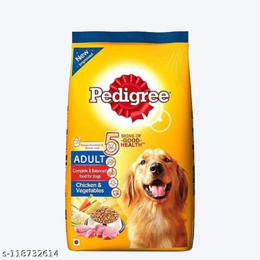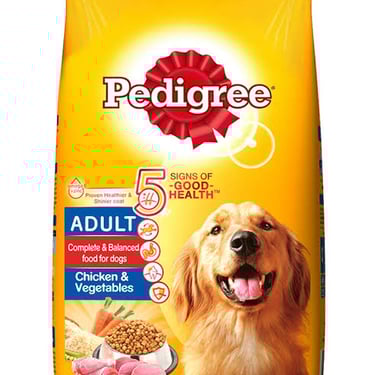 Pedigree Dry Food — Crunchy kibble for all sizes and ages: Adult (Chicken & Vegetables, Meat & Rice), Puppy (Chicken & Milk), Vegetarian options.
