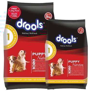 Drools Chicken and Egg: A formula available for both puppies and adults, made with real chicken to support muscle mass and energy. It also includes an optimal ratio of Omega-6 and Omega-3 fatty acids for a healthy coat.
